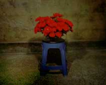 赤に染まった旗を持って、高速道路の分岐点に立つ男性や、プラスチックの簡易椅子の上に乗った、赤い造花。