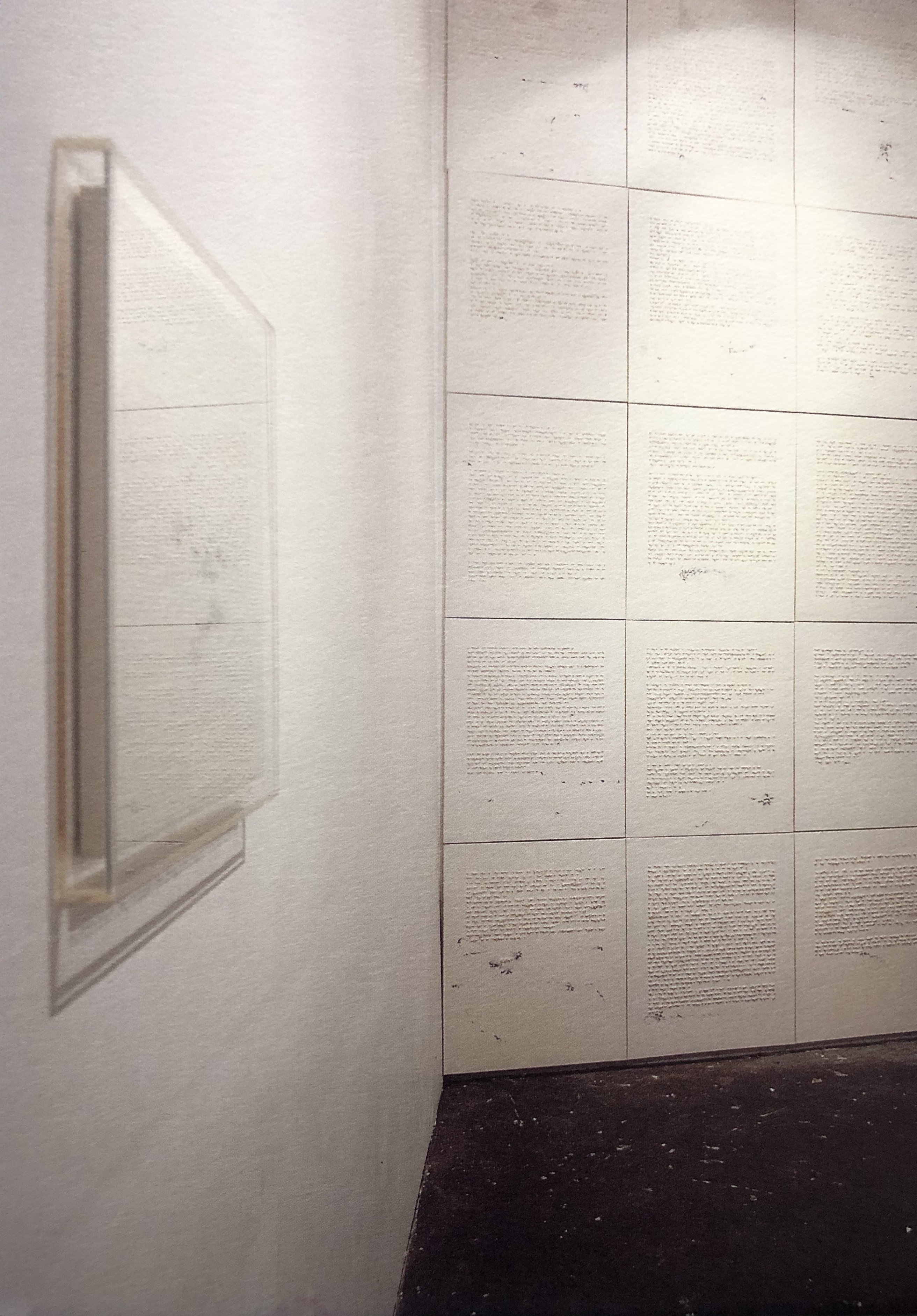 ガラス盤や鏡、カンバスに打ち付けられたように並ぶくさび文字のようないびつな四角形や、白いキャンバスに綴られたささくれた白い糸の一刺し一刺しが、何かのメッセージを持ったコードのように見える。