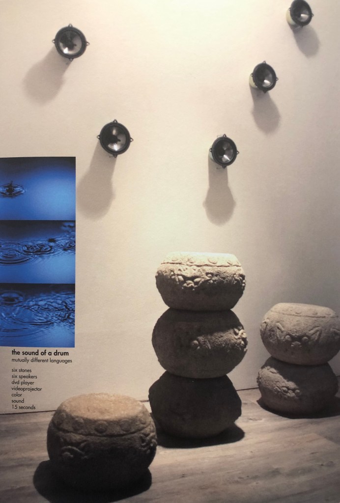 「the sound of a drum」は、太鼓の形に掘られた花崗岩がつみあげられ、太鼓の叩く皮の部分に映像が映されている。