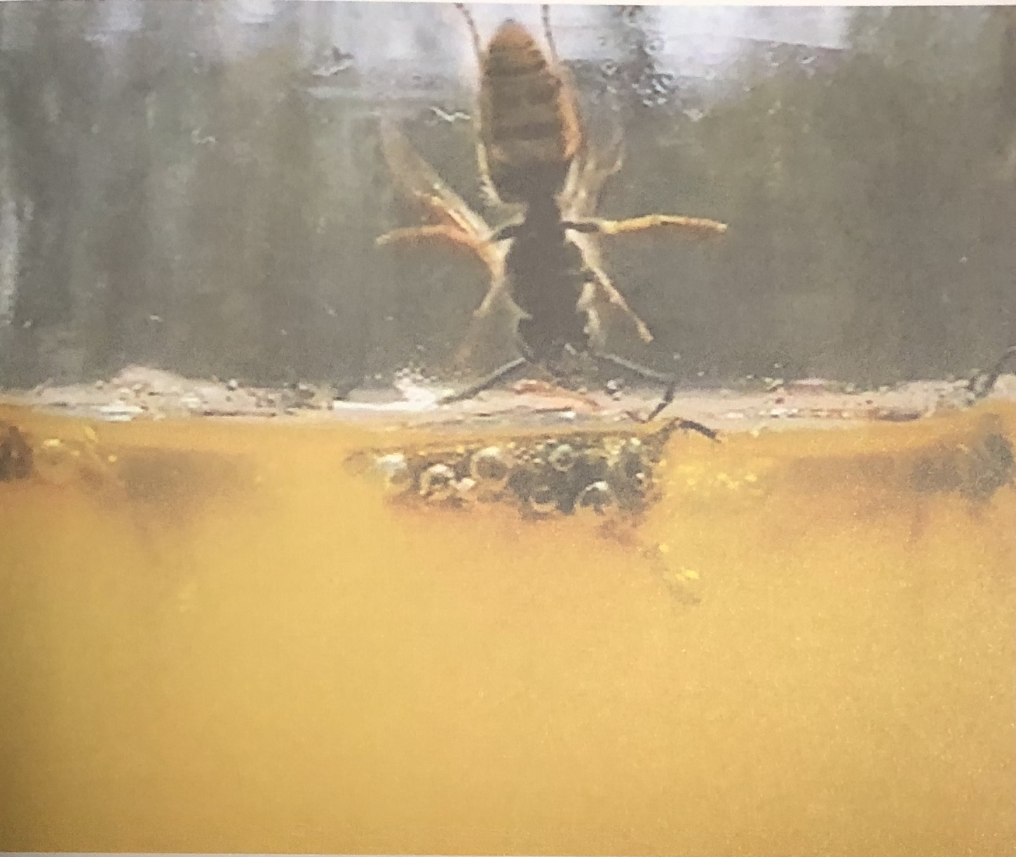 上が緑、下が黄色の画面に、虫が訪れ黄色部分に溺れていくのを見て、これが蜜(実はオレンジ味のファンタ)であることがわかる。
