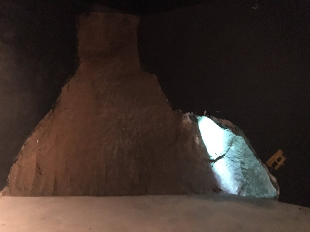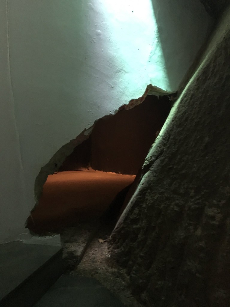 建物内の階段の踊り場や展示室に行くと、いきなりむき出しの岩に出くわし、驚かされる。