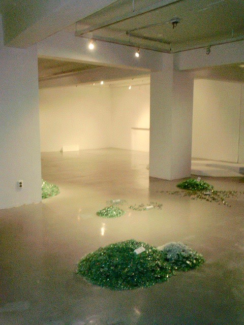 今回の『Play-Points』もコカ・コーラのビンを粉々に砕き、展示場のあちこちにガラス片の山を作ってインスタレーション作品としている。