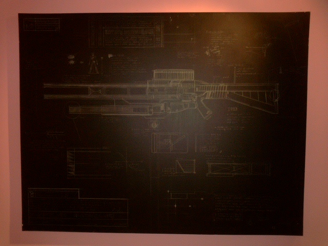 こちらは架空の新式武器の精密な設計図をアクリルで描いたものである。
