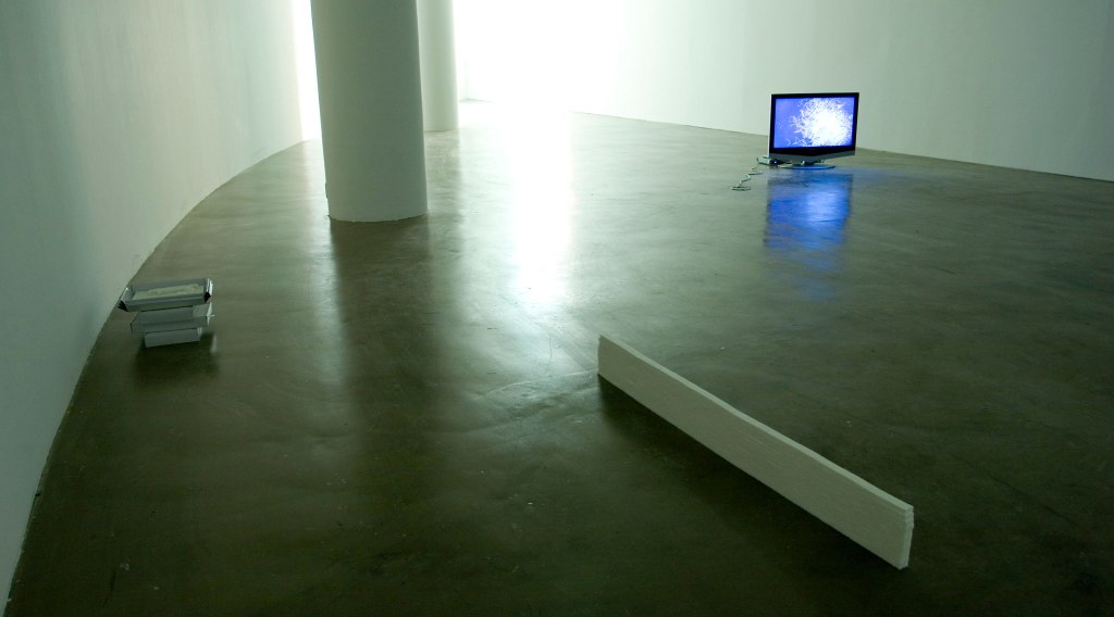 今回は、角砂糖で作られた小さな壁のようなオブジェがぼんやりと暗いスペースに置かれたインスタレーションを行っている。