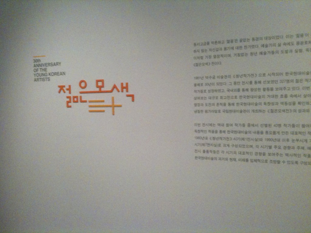 民主化以降、韓国現代美術を国際化させる政策が国家的にも取られ、国立現代美術館もそうした観点のもと仕事を行ったこと、またそれに加えて美術作家らも、1989年の海外渡航自由化やその後のグローバリズムという時代の波を巧みに利用し自ら挑んでいったという意味では、1980年台と1990年代の様相はかなり異なる。そのため、展示室は1980年台(青年作家展時代)と1990年台以降(若い模索展時代)に分けられている。