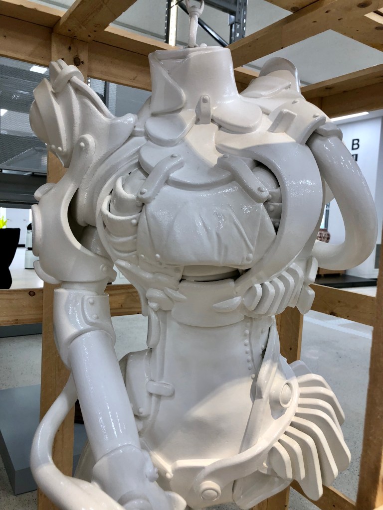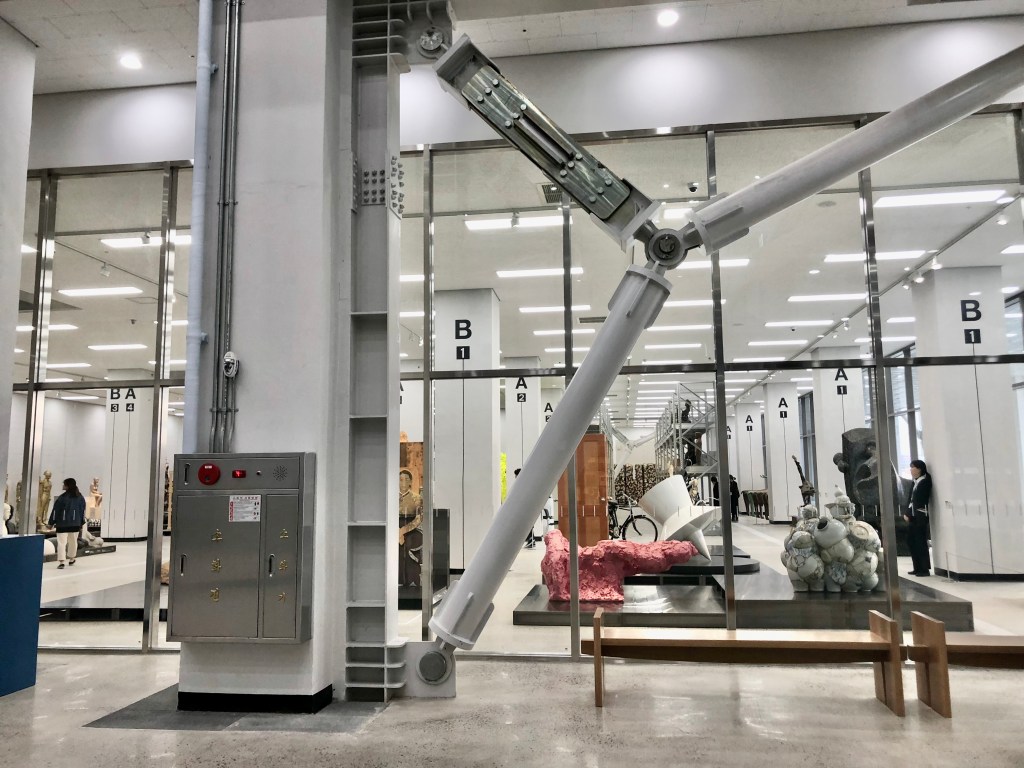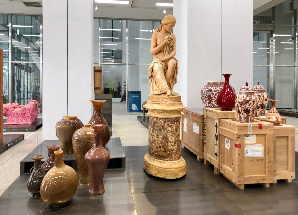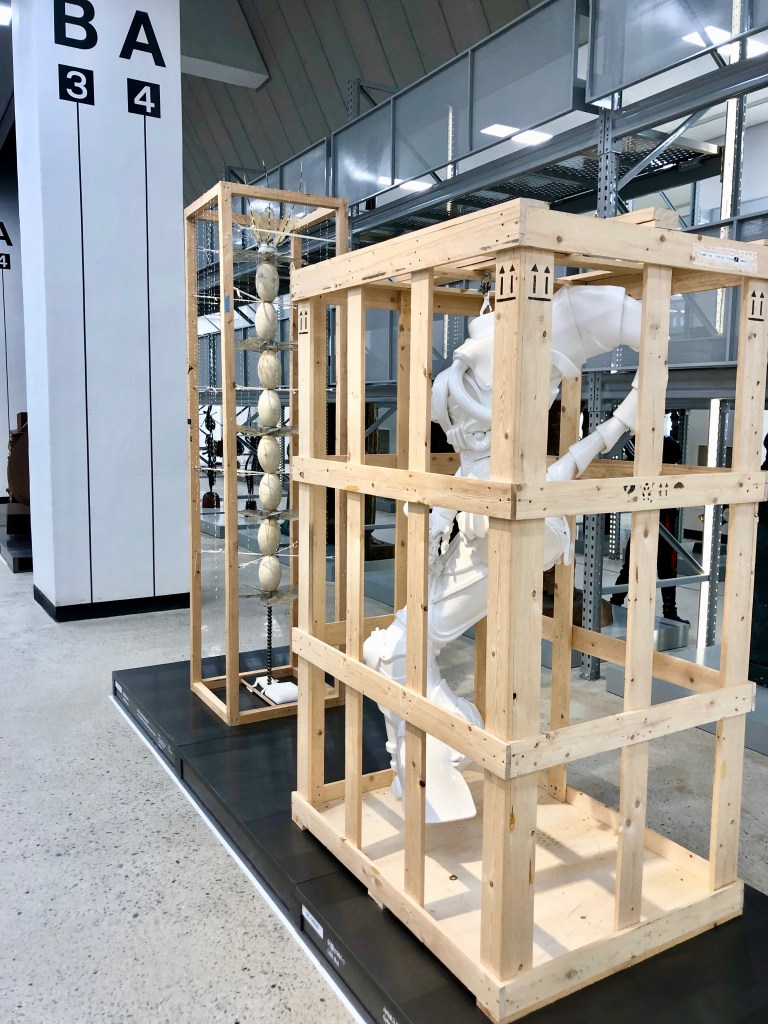 展示といっても、説明はタイトルと作者程度のキャプション程度で、あとは収蔵用の無機質な金属製の棚、あるいは運搬用に木で組まれた梱包に入ったままで並べられているという印象だ。