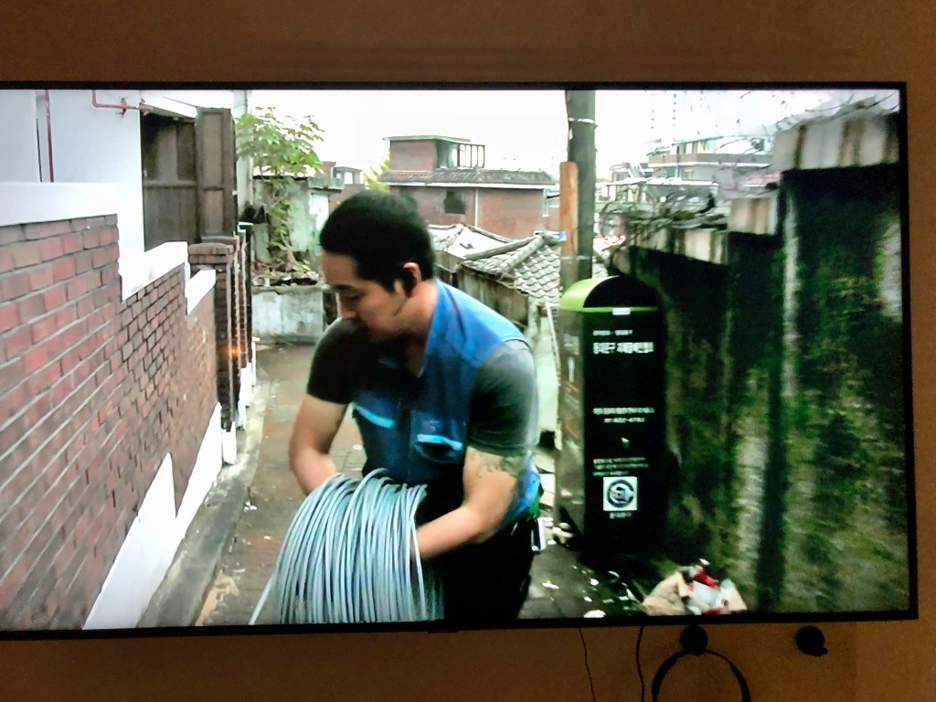 2016年光州ビエンナーレや2014年のイルミン美術館『トータルリコール』展などで有名になった作品。電気会社非専属の電気工事業者が、街の迷路のような路地に長いケーブルをひたすら伸ばしていく。電信柱に命綱をつけて登り作業する様子が、突然合成前のクロマキー(動画の合成に用いる、ある特定の色部分を処理で透明にし、他の映像を重ねられるようにする技法のこと)画面になり、現実からかけ離れた戯曲的な作業に見えるようになる。手作業の神聖化と軽視(賃金的なものを含む)という極端な消費の仕方を、人々に見せつける。