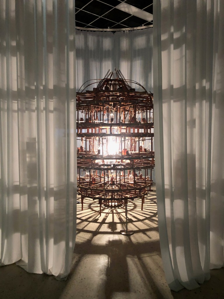木で作られたからくりがテオ・ヤンセンを彷彿とさせるが、雨だれのようなリズムで動くそれらが静物的であり、抽象画を見ているようでもある。