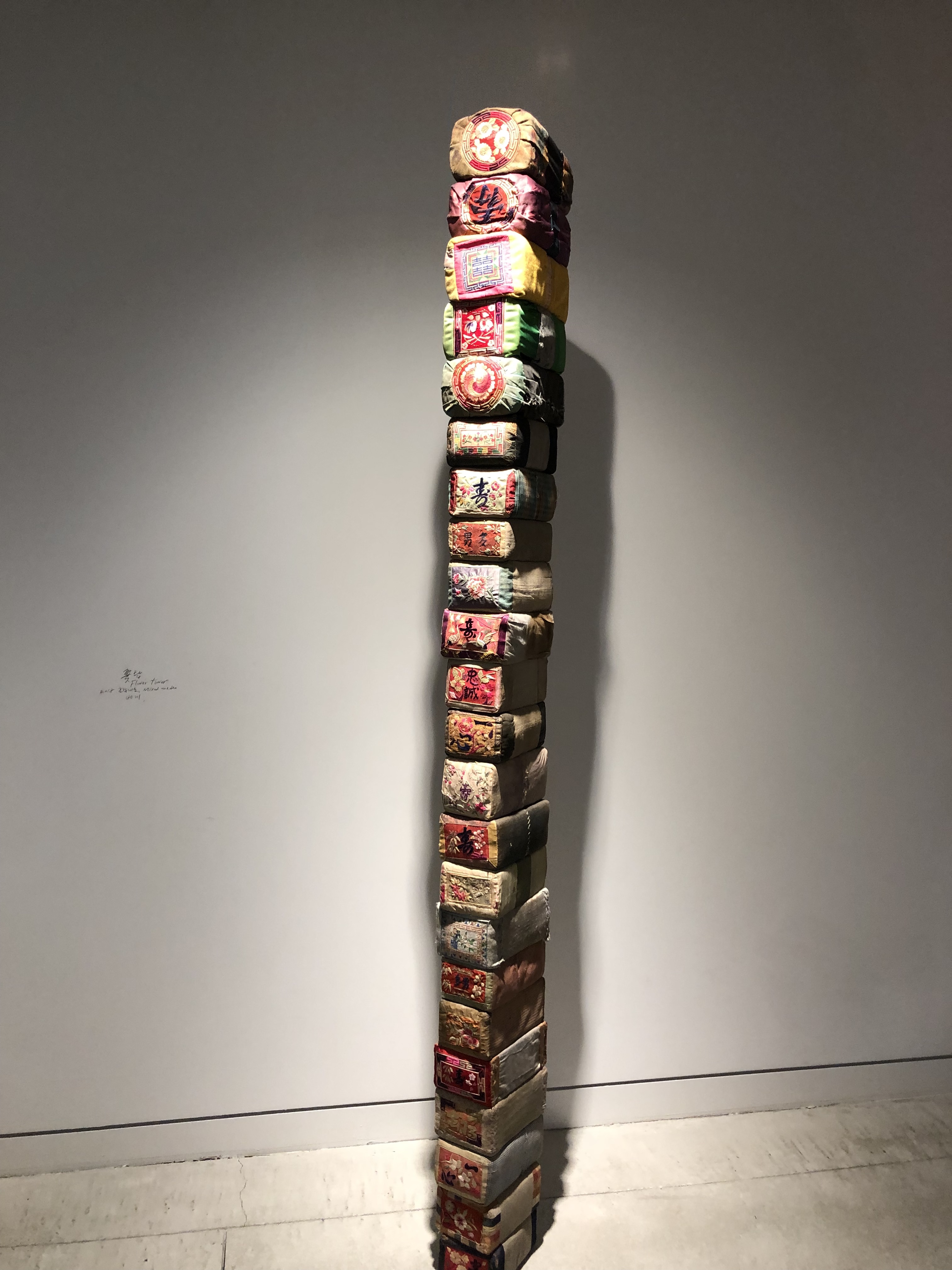 色鮮やかな刺繍が施された、嫁入り道具の枕がタワーになっている