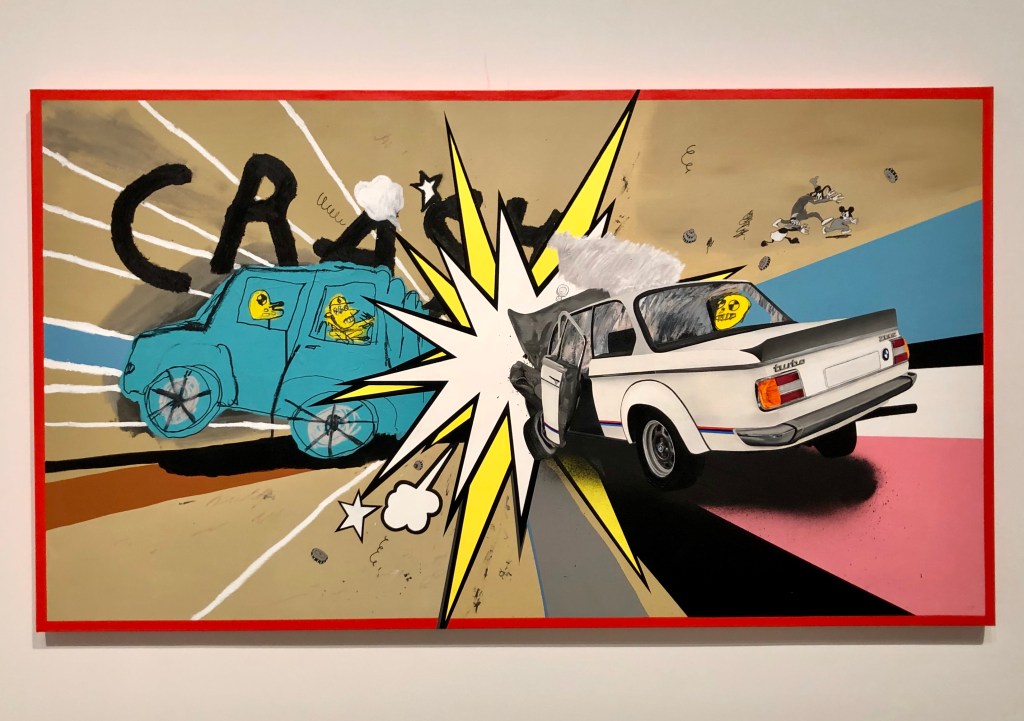 忠実に描かれたBMWとアメリカンコミック的な表現に、子供の落書きのようなくだけて気の抜ける描写を合わせることで、アメコミやリキテンスタインの絵画で見られる緊張感を解く、新しいポップアートの方法を提案してくれている。