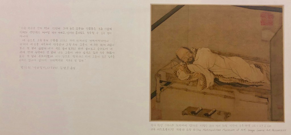 写真上:ニューヨークメトロポリタン美術館所蔵の作家未詳『竹の椅子にて眠る人』元〜明時代ごろ、絹に水墨彩色。横にはパク・ジウォン(박지원、朴趾源)の『熱河日記』(1780年、キム・ヒョルジョ訳・トルベゲ社刊)の一節が鉛筆で壁に書かれている。「今、天主堂内の壁と天井に描かれている雲霧と複数の人物像は、普通の人間の知恵や考えでは推し量れるものではなく、言語や文字でも形容できるものではない/私が目で絵の人物を見ようとすれば、稲妻のようにぴかぴかと光が私の目を他に外らせた。絵の中の彼らが私の心を悠々と見抜いているようで嫌だった。私が耳で聞こうとすれば、先に私の耳に囁こうとするように見下ろしたり見上げてきたりした。私は彼らが私の隠そうとするものを悠々と見抜いているようで恥ずかしかった。私が口で語ろうとすれば、彼らは深く沈黙したと思ったら突然雷鳴霹靂を発するようであった」