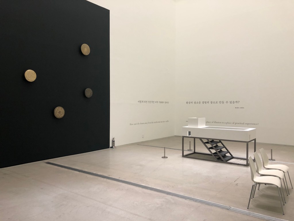 黒く塗られた壁にはチンとケンガリ(巫堂がクッで用いる金属の打楽器。ケンガリの方が小さく手も持ちにできる)が北斗七星の形で象られて何かまじないあるいは吉兆を感じさせ(『七星』)、その脇にはベルトルト・ブレヒトの「どのようにすれば、精神的な麻薬取引を脱し、幻想の場を実体験の場にすることができるのか?(How can it be drawn away from this intellectual narcotics-traffic and be changed from a place of illusion to a place of practical experience?)」という問いが示されている。