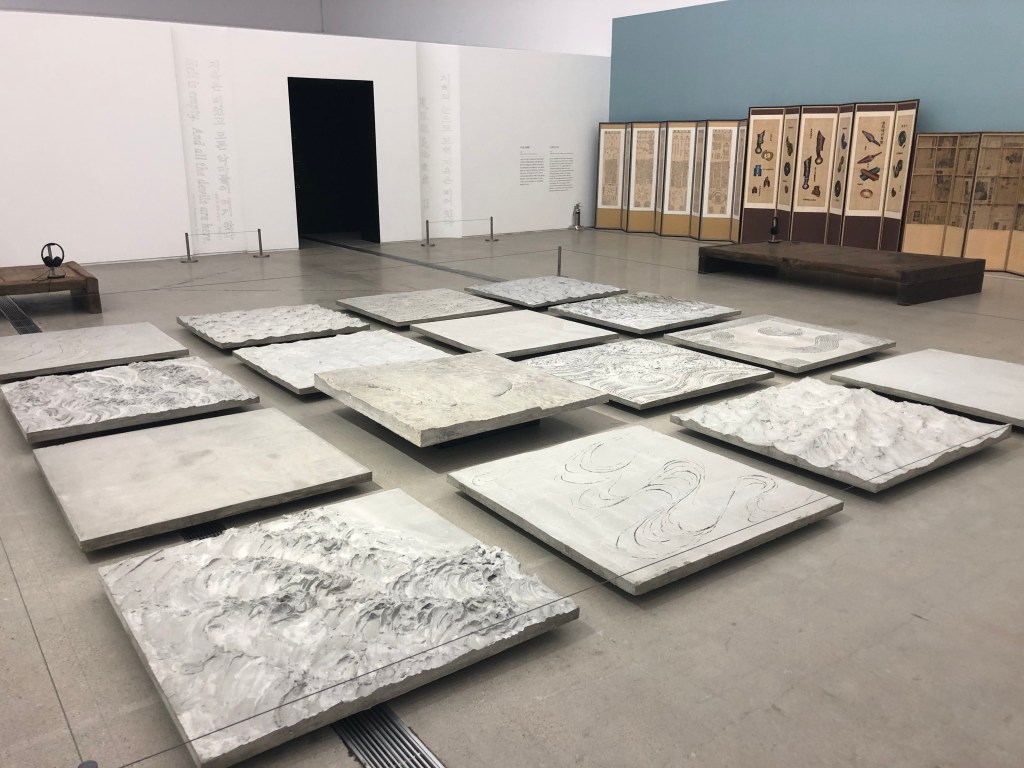 もっとも広いスペースには、韓屋の廃材で作ったベンチ2つとセメントで描写した水面が16種類ならぶ作品『海印』が据えられている。