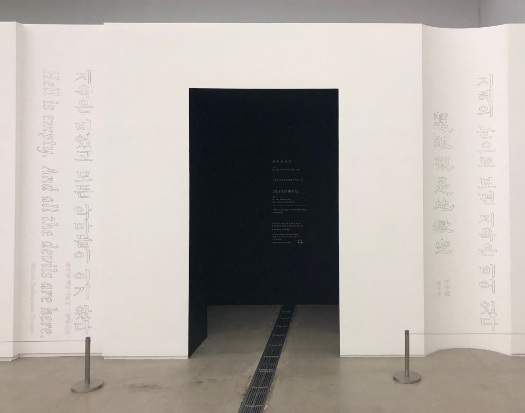 ここ国立現代美術館ソウル館の建物は前身が機務司、その前は日帝時代に設立された官立京城醫學專門學校であった。その当時から現在も使われている向かって左側は角柱、右側は円柱となっている正門の柱を模し、寺院などによくある対の細長い書画の板(聯)を柱に掲げた柱聯となるようにブース入口を象っている。右側の柱にはソウルの津寬寺(진관사)の柱聯にある「慧眼觀是地獄空」という千手経の言葉が書かれ、その横に「智慧の眼で見れば地獄は空(くう)となる」と意味が解読されている。また左側の柱には、シェイクスピアの戯曲『テンペスト』のセリフ「Hell is empty, and all the devils are here.(地獄は空っぽ、総ての悪魔はここに在り)」が英語と韓国語で書かれており、この世に対する絶望感と、それから救われる世の捉え方が一対となっている。