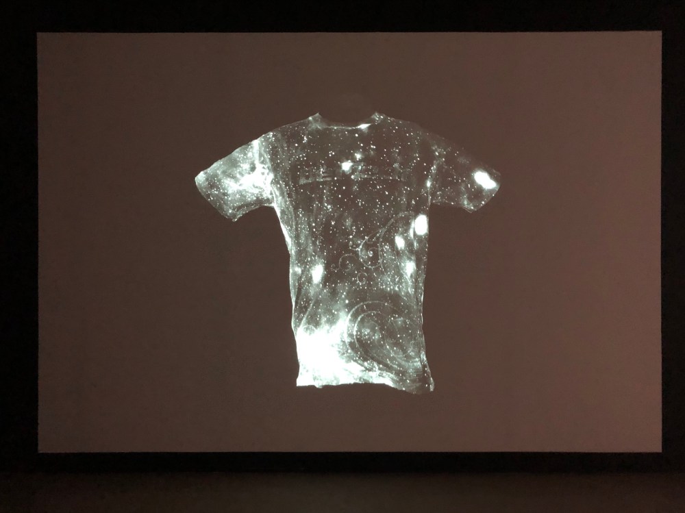 先に紹介した『跣足』、『海印』の向こうに見える映像ブース入り口の両脇に据えられた『柱聯』、そしてブース内で毎時0分から上映されている55分の映像作品『遅れてきた菩薩』と、多くの作品が仏教モチーフを借りて制作されている。