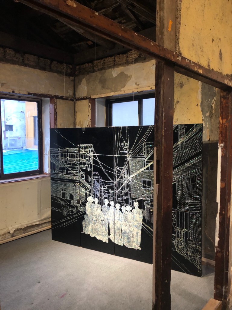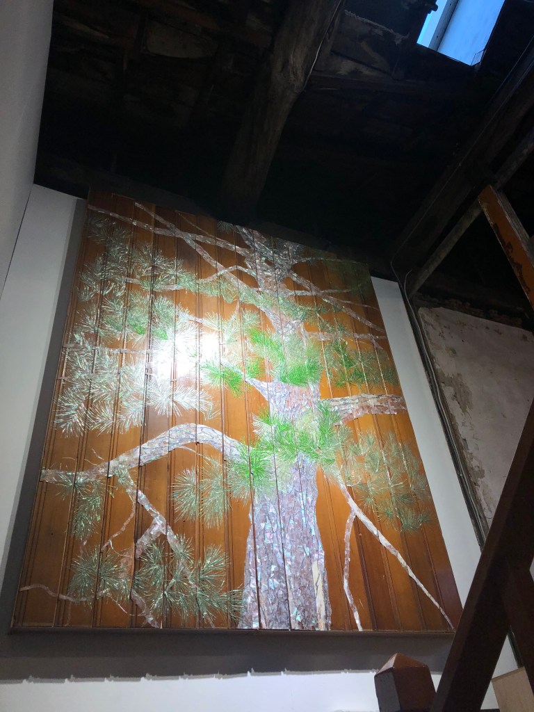 展示スペースには、実際に解体撤去される家から運び出されたタンスの扉や床の廃材が、螺鈿で彩られた作品が並んでいる。