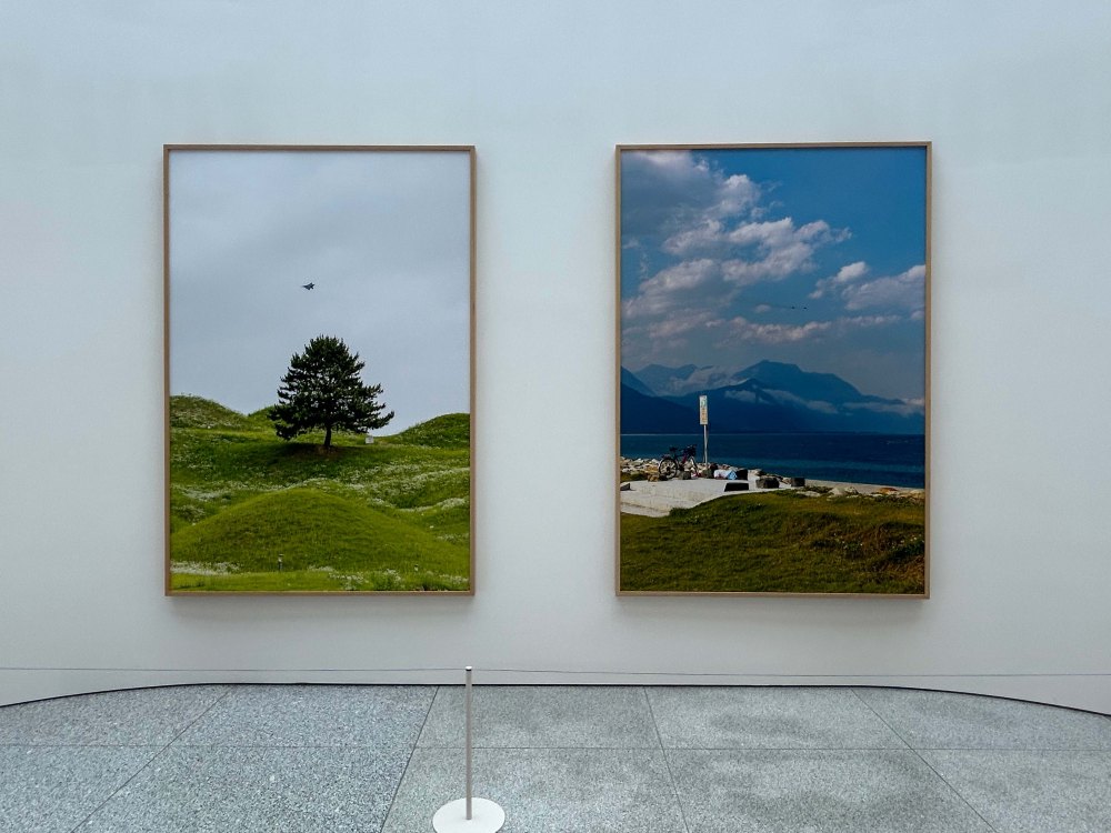 人が寝転んでリラックスしているような、いかにも平和な丘と海の上に戦闘機が飛んでいる。